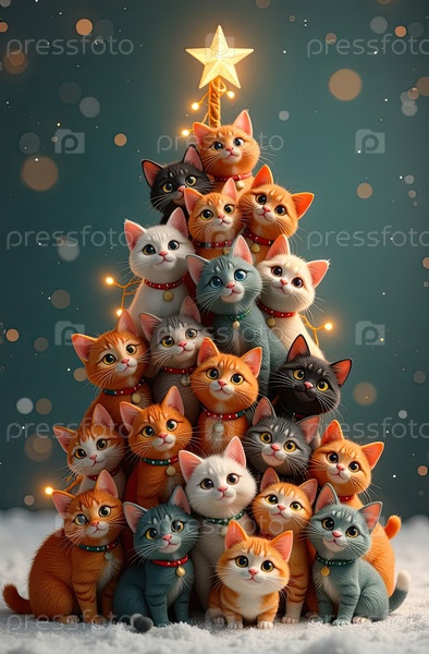 Мультфильмовая рождественская елка из кошек, сделанная на праздничном фоне с блеском, многоцветные сотни кошек складываются в форме высокой Рождественской елки с золотыми светящимися гирляндными огнями