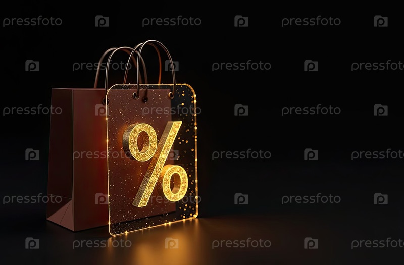 Неон светящийся золотой процентный знак на черном фоне. витрина магазина для Черной пятницы, распродажи, скидки, сумки для покупок. баннер, флаер. AI generated