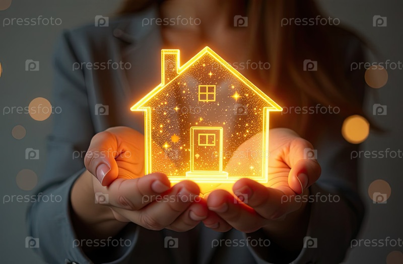 Золото светящийся символ уютного дома В ладонях рук с золотым блеском. Недвижимость, риэлтор, ипотека, страхование, бронирование, изоляция, мечта о собственном доме. ИИ генерируется