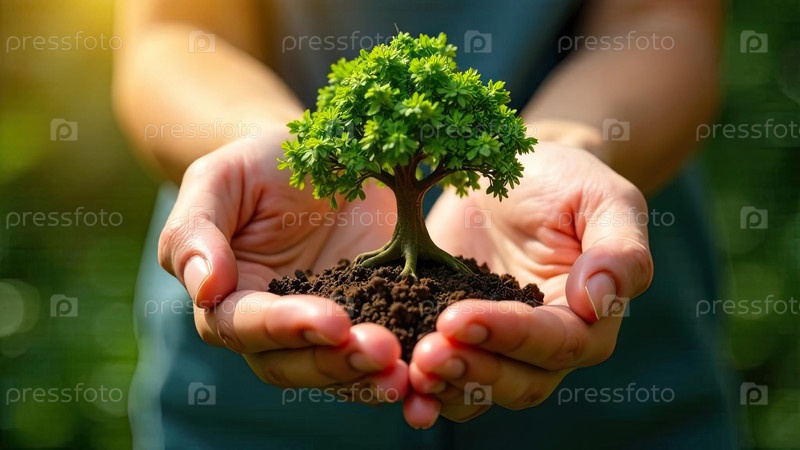 Крошечное зеленое дерево в горстке земли в руке в земле на близком расстоянии.Экология, уход, бонсай.Искусственный интеллект создан