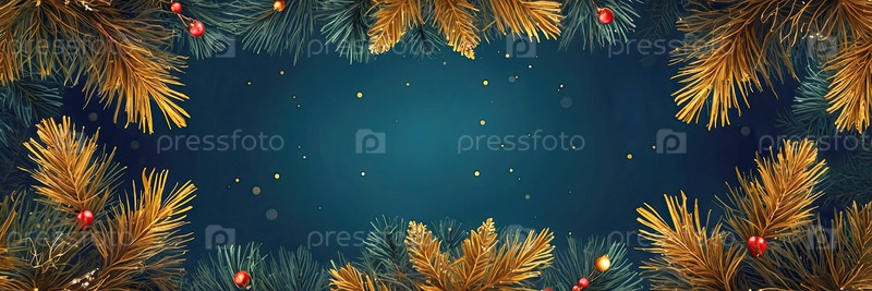 Рождественская открытка с кописпейсом на праздничном снежном фоне с елкой, рождественскими шарами, свечами, конусами и блеском