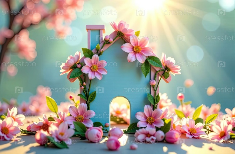Крошечный дом в солнечных лучах, украшен весенними пастельными цветами на весеннем пастельно-синем фоне. недвижимость, риэлтор, ипотека, страхование, бронирование, строительство, изоляция. ИИ генерируется