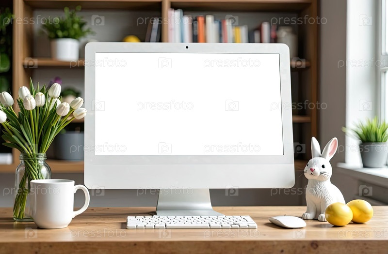 Компьютерный монитор с белым экраном макет на столе в уютном домашнем офисе с цветными яйцами и пасхальным кроликом, букетом весенних цветов в вазе на столе И белой чашечкой кофе