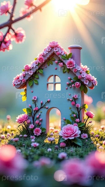 Крошечный дом в солнечных лучах, украшен весенними пастельными цветами на весеннем пастельно-синем фоне. недвижимость, риэлтор, ипотека, страхование, бронирование, строительство, изоляция. ИИ генерируется