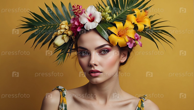 Белая женщина с тропической цветочной короной и полосатым верхом, летний портрет пляжной красоты, живая энергия, отпускное настроение