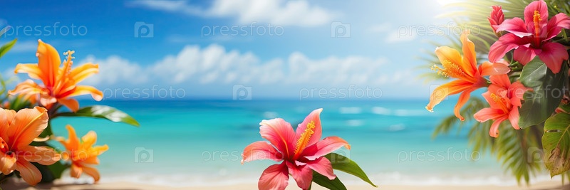 Панорамный тропический пляж с летними цветами и пальмой, голубое небо, море и пространство для копирования сообщений или рекламных текстов