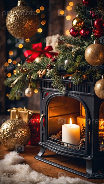 Рождественская открытка с уютной свечой в камине с елкой, рождественскими шарами, светильниками, конусами и блеском