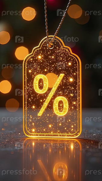 Неон светящийся золотой процентный знак на ценнике с блеском на рождественском фоне. флаер для Черной пятницы, Нового года, Рождественской распродажи, скидки. ИИ генерируется