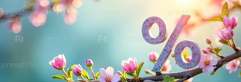 Процентный знак в солнечных лучах, украшен весенними пастельными цветами.Весенние распродажи и скидки, 8 марта, Пасха, баннер женского дня, флаер с копировальным пространством. ИИ генерируется