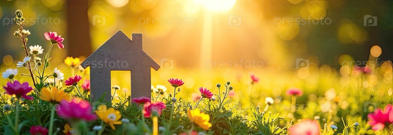 Крошечный экологический каркасный дом теплица в солнечных лучах, с летними цветами на солнечном фоне в поле. недвижимость, дача, летний дом, ипотека, страхование, бронирование, строительство, изоляция. ИИ генерируется