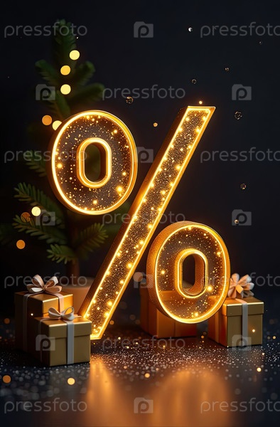 Неон светящийся золотой процентный знак на рождественском фоне с елкой, блесками и коробками для подарков. витрина магазина в Черную пятницу, Новый год, Рождественская распродажа, скидки. баннер, флаер. ИИ генерируется