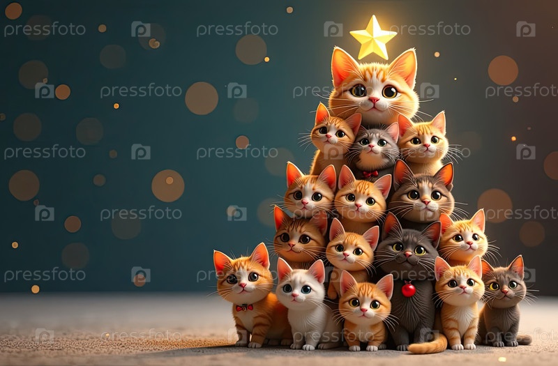 Мультфильмовая рождественская елка из кошек, сделанная на праздничном фоне с блеском, многоцветные сотни кошек складываются в форме высокой Рождественской елки с золотыми светящимися гирляндными огнями