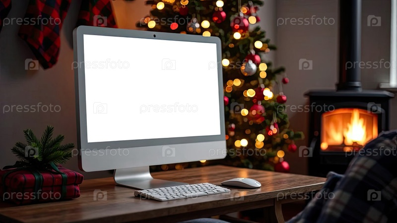 Монитор домашнего компьютера с белым экраном макет на столе в уютном домашнем офисе рождественского декора, елки и горящего камина с гирляндами
