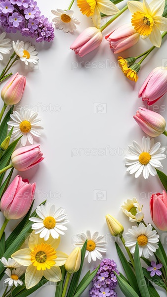 Рамка с весенними цветами тюльпаны, нарциссы на белом фоне - Весенняя открытка со свободным текстом для 8 марта, женского дня, Пасхи