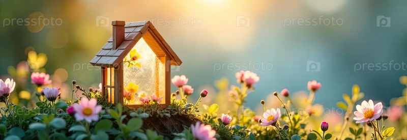 Крошечный эко-дом теплица в солнечных лучах, с весенними цветами на весеннем пастельном фоне. недвижимость, дача, летний дом, ипотека, страхование, бронирование, строительство, изоляция. ИИ генерируется