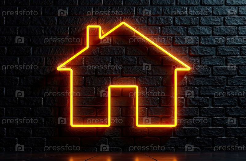 Прозрачное золото светящийся символ дома на фоне черной кирпичной стены с золотым блеском. недвижимость, риэлтор, ипотека, страхование, бронирование, строительство, изоляция, отопление. AI generated