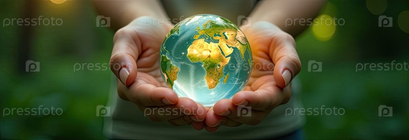 Стеклянная светящаяся сфера планеты Земля На ладонях находится шар с внутренним микроклиматом, заботой о планете, чистой окружающей среде, защитой экологии, географии, континентов, путешествий