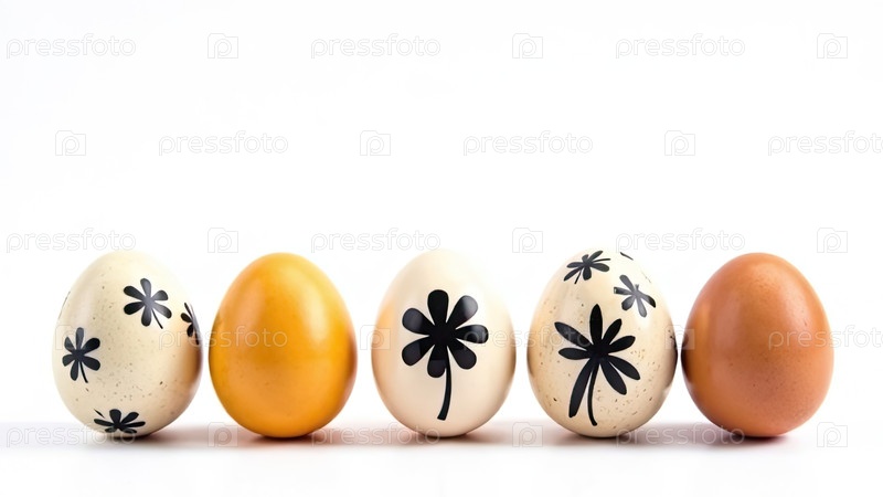 Внизу изображения пять яиц со свободным пространством сверху для текста, творческий цветочный черный рисунок на цветах-яйцах, белый фон. Пасхальный баннер с пробелом для текста. ИИ генерируется