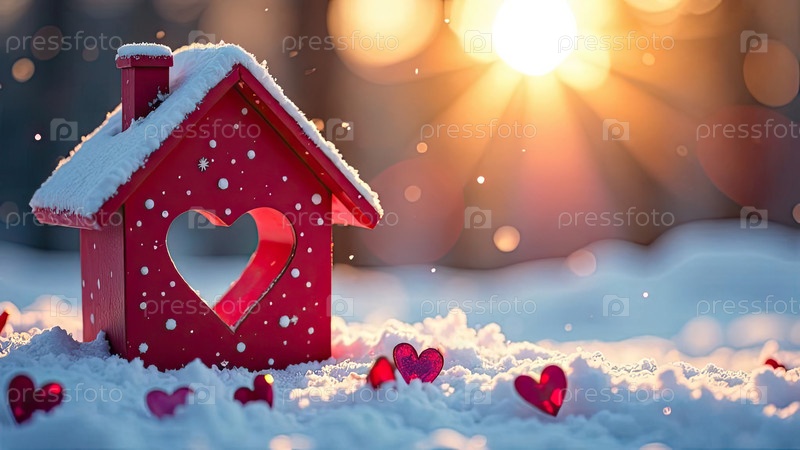 Уютный красный крошечный дом на снегу в солнечных лучах, украшенный красным сердцем и декором Валентина