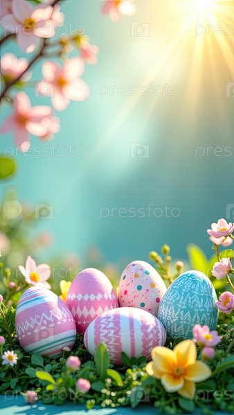 Пасхальные яйца украшены узорами, полосами, волнами, точками солнечных лучей, украшаются весенними пастельными цветами на весенне-синем фоне
