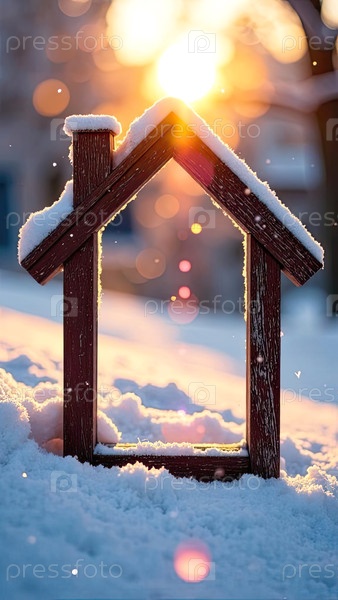 Уютный каркас крошечный дом на снегу и заснеженном фоне в солнечных лучах, с рождественским декором. недвижимость, риэлторская деятельность, ипотека, страхование, бронирование, зимовка, изоляция, отопление. ИИ генерируется