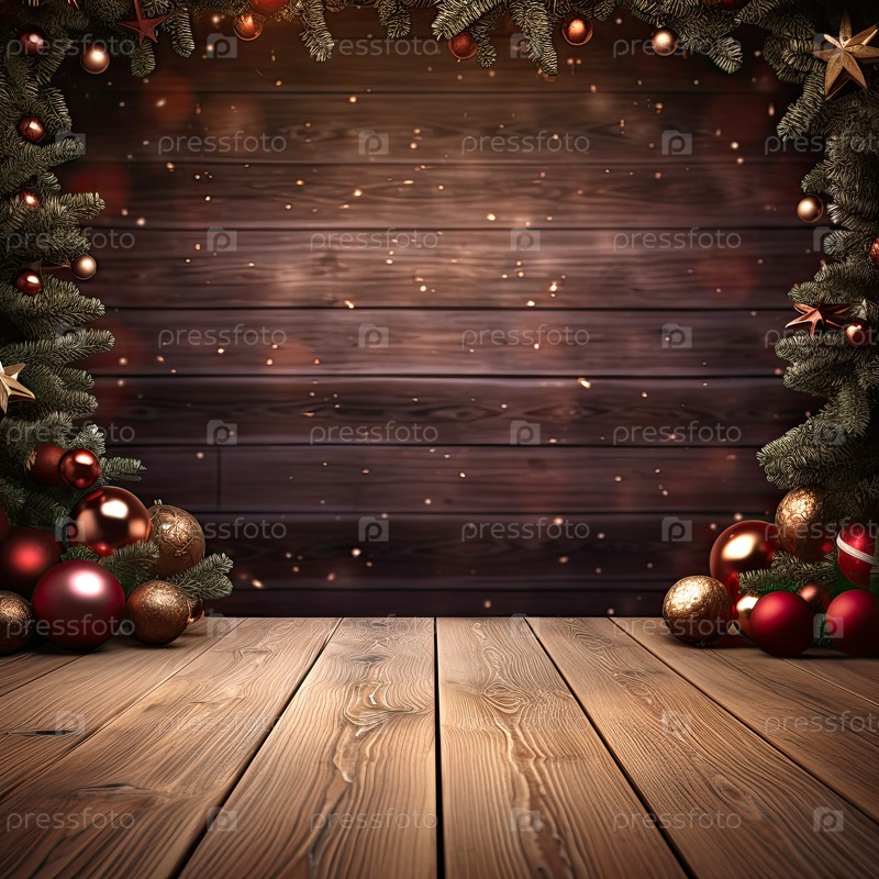 Пустой деревянный пол и стена для монтажа продуктового дисплея с рождественским декором, боке, секины и фейры. Копирование пространства, Рождество и Новый год. ИИ генерируется