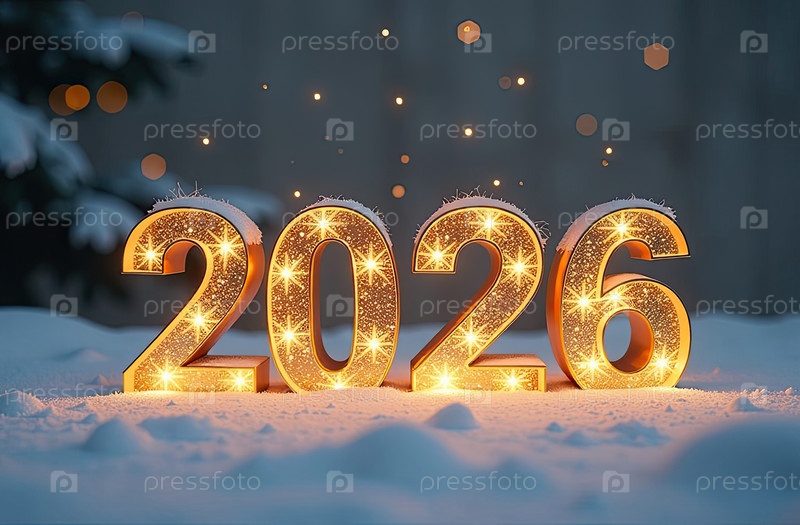 Прозрачные золотые светящиеся числа 2026 на снежном фоне Нового года с золотыми гирляндами боке, секины, звезды, снег, блеск. Поздравления, открытка. Календарь, обложка. AI generated