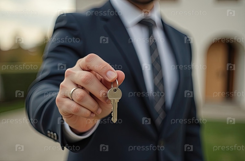 Недвижимость человек в костюме, держит ключ от дома в своей руке рядом с коттеджем - продажа, переезд, бронирование, проект коттеджа, ипотека, жилье и страхование недвижимости