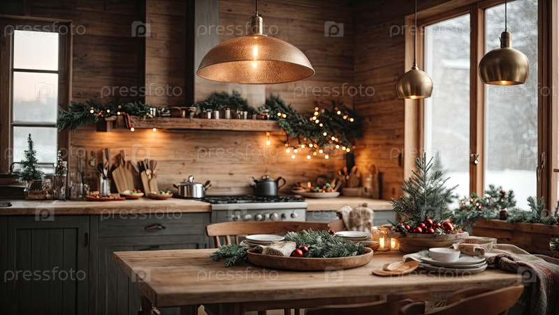Уютная деревенская кухня с рождественским декором, новогоднее настроение, подготовка к празднику, посуда.Счастливого Рождества и счастливого Нового года поздравительную карточку, тепло дома.Искусственный интеллект генерирует