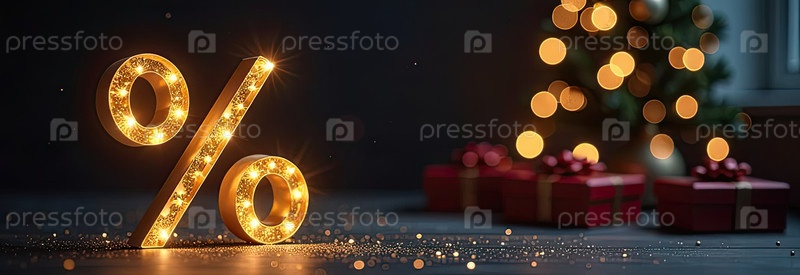 Неон светящийся золотой процентный знак на рождественском фоне с елкой, блесками и коробками для подарков. витрина магазина в Черную пятницу, Новый год, Рождественская распродажа, скидки. баннер, флаер. ИИ генерируется