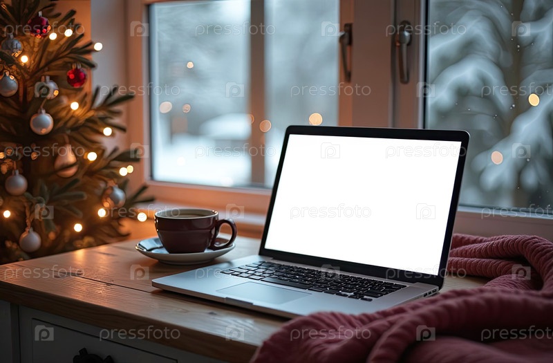 Ноутбук с белым экраном макет на столе в уютном домашнем офисе рождественского декора в стиле лофт