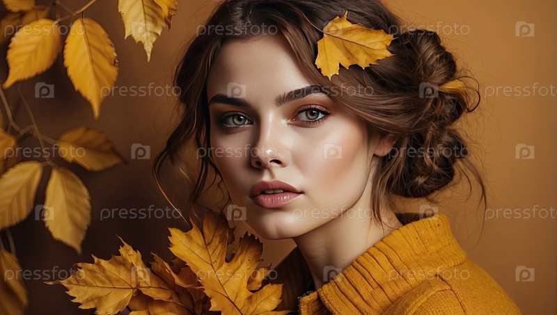 Женщина с темными волосами и желтыми листьями, осенний тематический портрет, оранжевый фон, уютная мода, естественная красота
