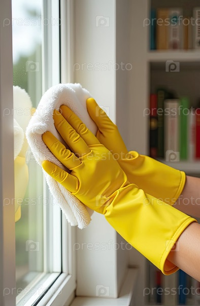 Руки в желтых резиновых перчатках моют окно салфеткой на близком расстоянии. служба очистки окон, уборка дома. созданный ИИ