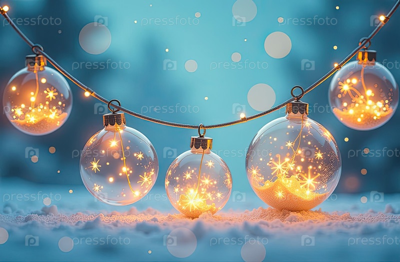 Гирлянда светящихся прозрачных шаров с золотыми огнями на синем фоне с блеском и боке. поздравительная карточка на Рождество и Новый год. ИИ генерируется