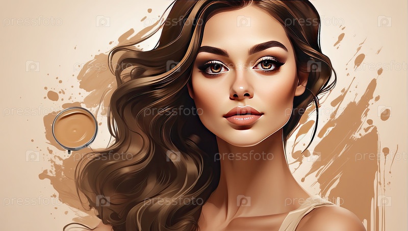 Акварельная иллюстрация молодой женщины с идеальным фундаментом, натуральным макияжем, светящимся тоном кожи, вдохновением для косметики, концепцией красоты