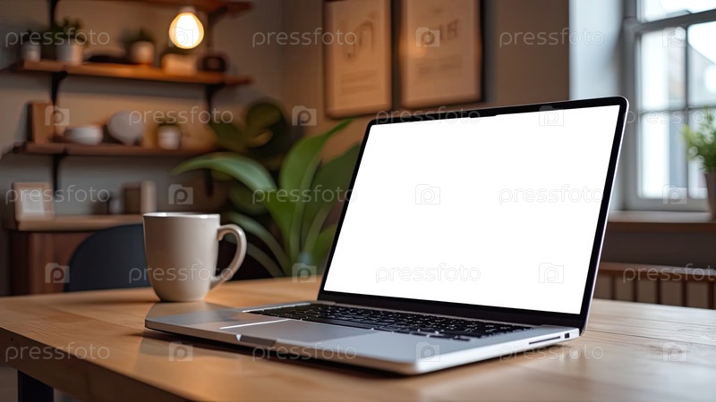 Ноутбук с белым экраном макет на фоне кафе в стиле лофт со стаканкой кофе на столе. удаленная работа, интернет, покупки. ИИ генерируется