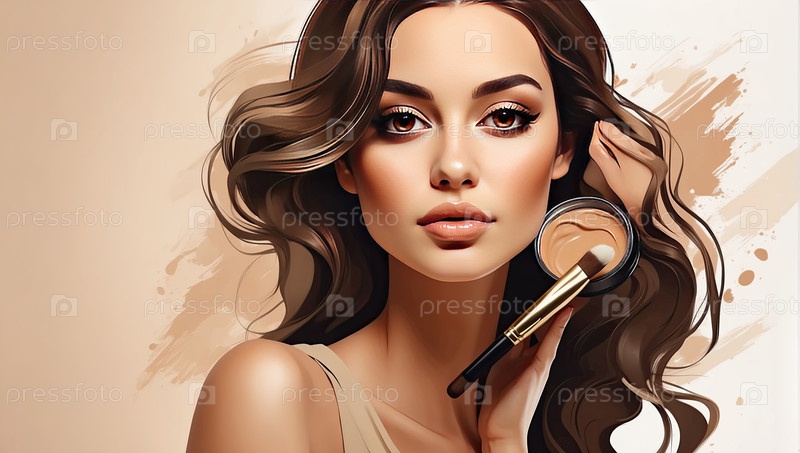 Акварельная иллюстрация молодой женщины, наносящей фундамент, концепция макияжа, даже тон кожи, красота и косметика, творческий стиль