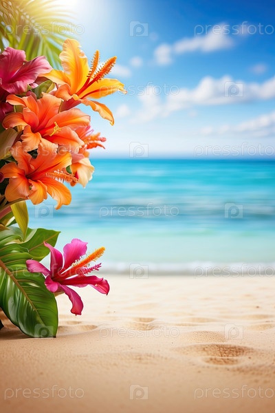 Вертикальное летнее изображение с тропическим букетом, пальмовыми листьями, чистой водой и копировальным пространством для текста, продажи или слогана