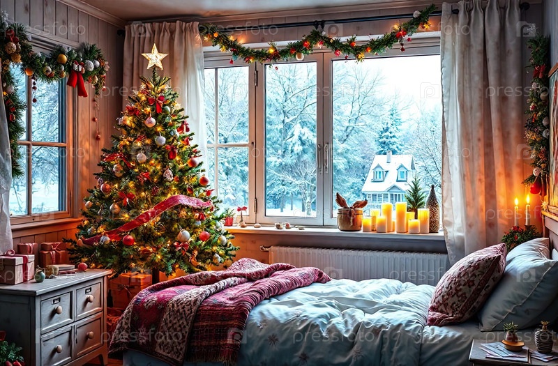 Уютная спальня с кроватью у окна с рождественским декором и елкой, теплыми гирляндами света и свечами - вид изнутри зимой и снегом. Отпразднуйте Рождество и Новый год, рождественское настроение. ИИ генерируется