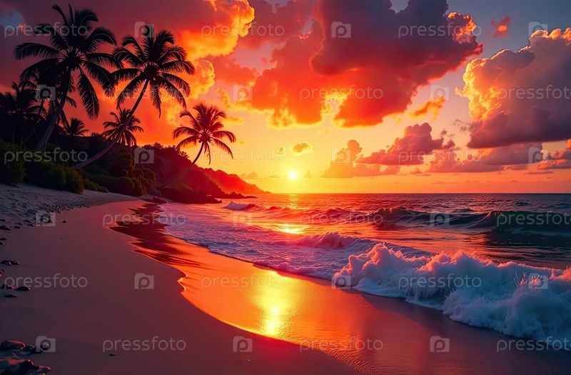 Тропическое панорамное побережье на закате, оранжево-красное небо, пальмы, отражения океана, горизонтальный фоне путешествия