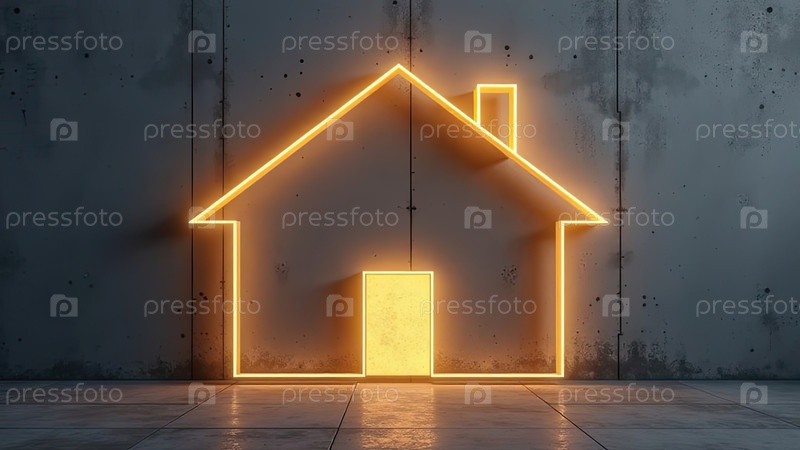 Прозрачное золото светящийся символ дома на сером бетонном фоне с золотым блеском. недвижимость, риэлтор, ипотека, страхование, бронирование, строительство, изоляция, отопление. ИИ генерируется
