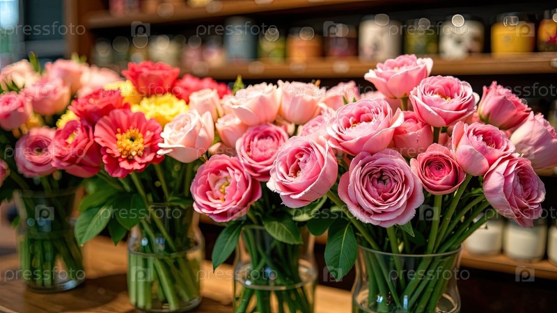 Красочные букеты роз в цветочном магазине - свежерезанные цветки на складе и стеллажи для продажи, доставка к празднику. весна 8 марта, женский день, день рождения. ИИ генерируется