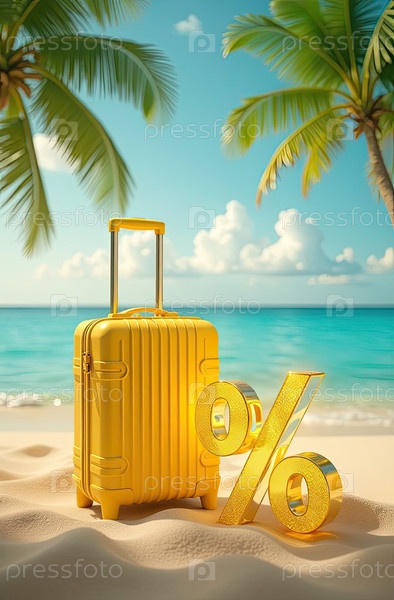 Золотой светящийся знак процент И желтый чемодан на берегу моря с тропическими пальмами под ярким солнцем, океанический закат в фоне. Горячие летние распродажи и скидки, горячий туристический баннер, листовка. AI генерируется