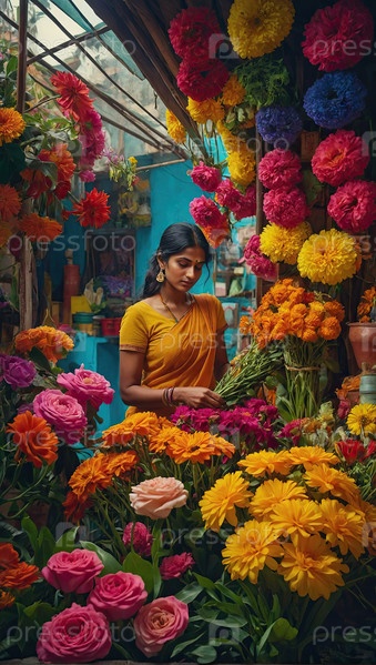 Индийская цветущая с косыми в сари, устраивающая букеты лотоса и марихуаны для праздников храма и Холи