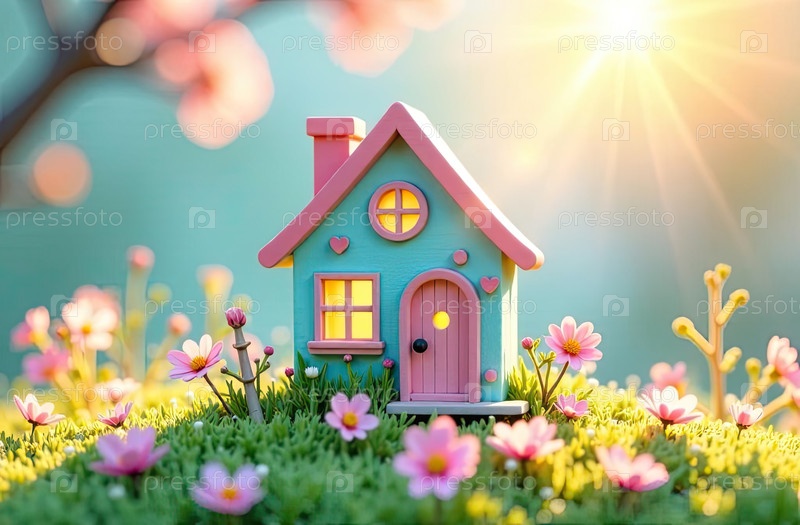 Крошечный дом в солнечных лучах, украшен весенними пастельными цветами на весеннем пастельно-синем фоне. недвижимость, риэлтор, ипотека, страхование, бронирование, строительство, изоляция. ИИ генерируется