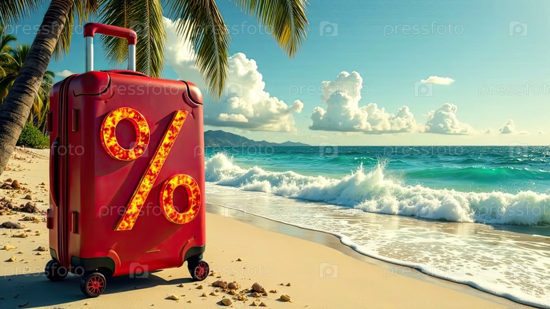 Огненный горящий знак процент И красный чемодан на берегу моря с тропическими пальмами в свете солнца, океанический закат на заднем плане. Горячая летняя распродажа и скидки, горячий баннер тура, листовка. AI генерируется