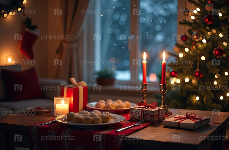 Установка праздничного рождественского стола в оформленном интерьере с большим окном и елкой. новогодний ужин, банкет для гостей. созданный ИИ