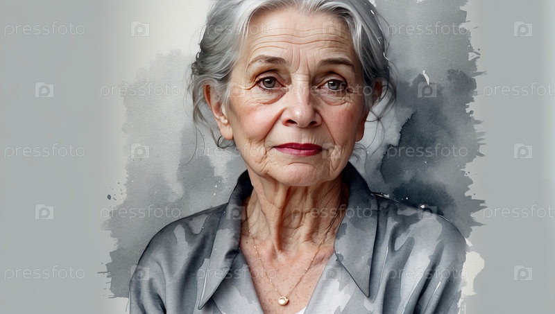Акварельная иллюстрация пожилой женщины с светло-серыми волосами в серой блузке, выразительный художественный портрет, изящное старение, творческий стиль, элегантное вдохновение