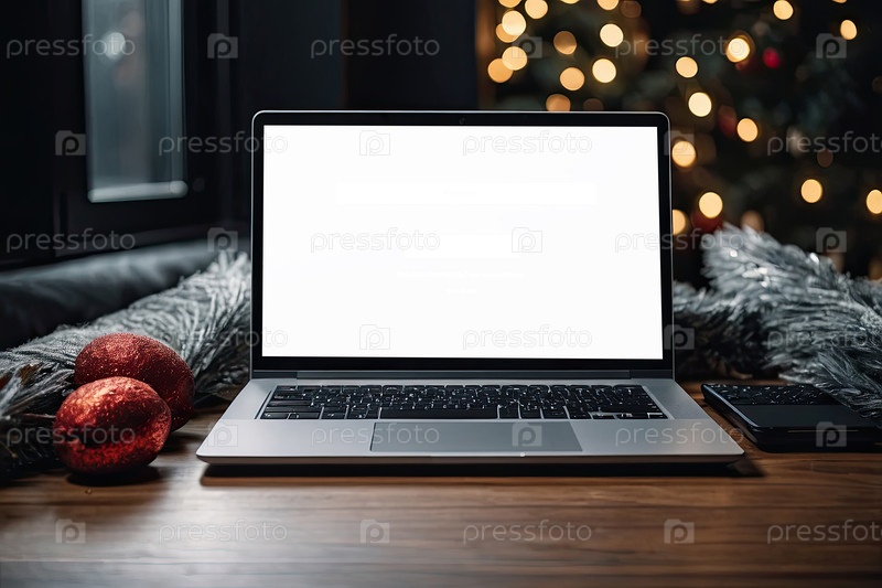 Ноутбук с белым экраном макет на столе в офисе рождественского декора с огнями боке, свечами, сверхурочной работой по праздникам, домашний офис, черная пятница,