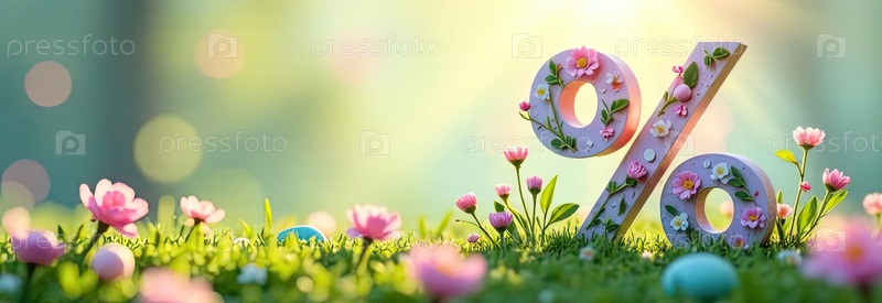 Процентный знак и пасхальные яйца в солнечных лучах, украшены весенними пастельными цветами